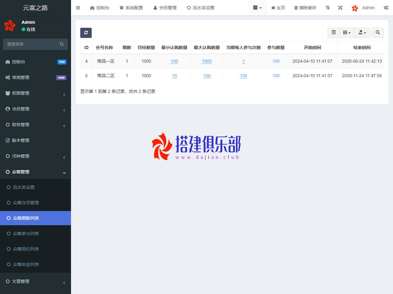 - 众筹板块的模式:设置众筹周期(这里以7天为例)就是第一天发布第一期的众筹产品,设定到期返利的分红点,第二天在第一天的众筹金额上增加30%,设定返利的分红点,以此类推。在第八天的时候,将第一期的产品全部用以分红,产品从第一期不断发布,但是不管是任何时间进场,都是以第一期为标,中途断场也是按第一期进入。